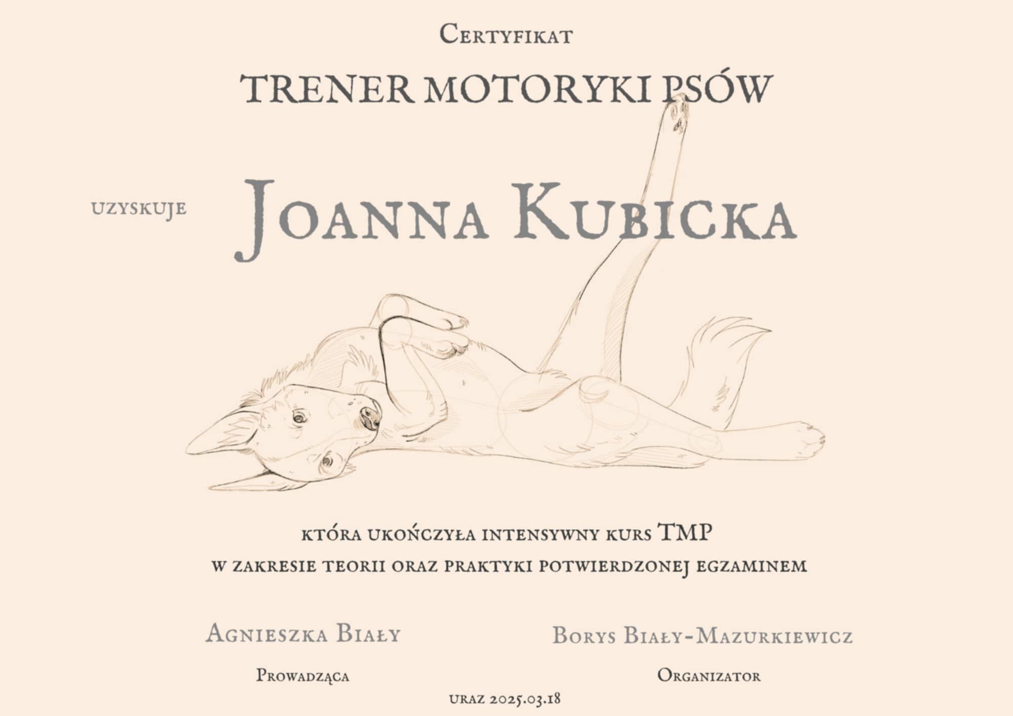 Moje podejście łączy twardą neurobiologię z wrażliwością na biomechanikę. Nie oferuję teorii z podręczników – oferuję metody, które przeszły najtrudniejszy test: walkę o pełną sprawność psa z deficytami neurologicznymi. Praca nad odbudową wzorców ruchowych i stymulacją neuroplastyczności pozwoliła mi zrozumieć, że to, co nauka nazywa „niemożliwym”, często jest po prostu kwestią znalezienia odpowiedniego bodźca.